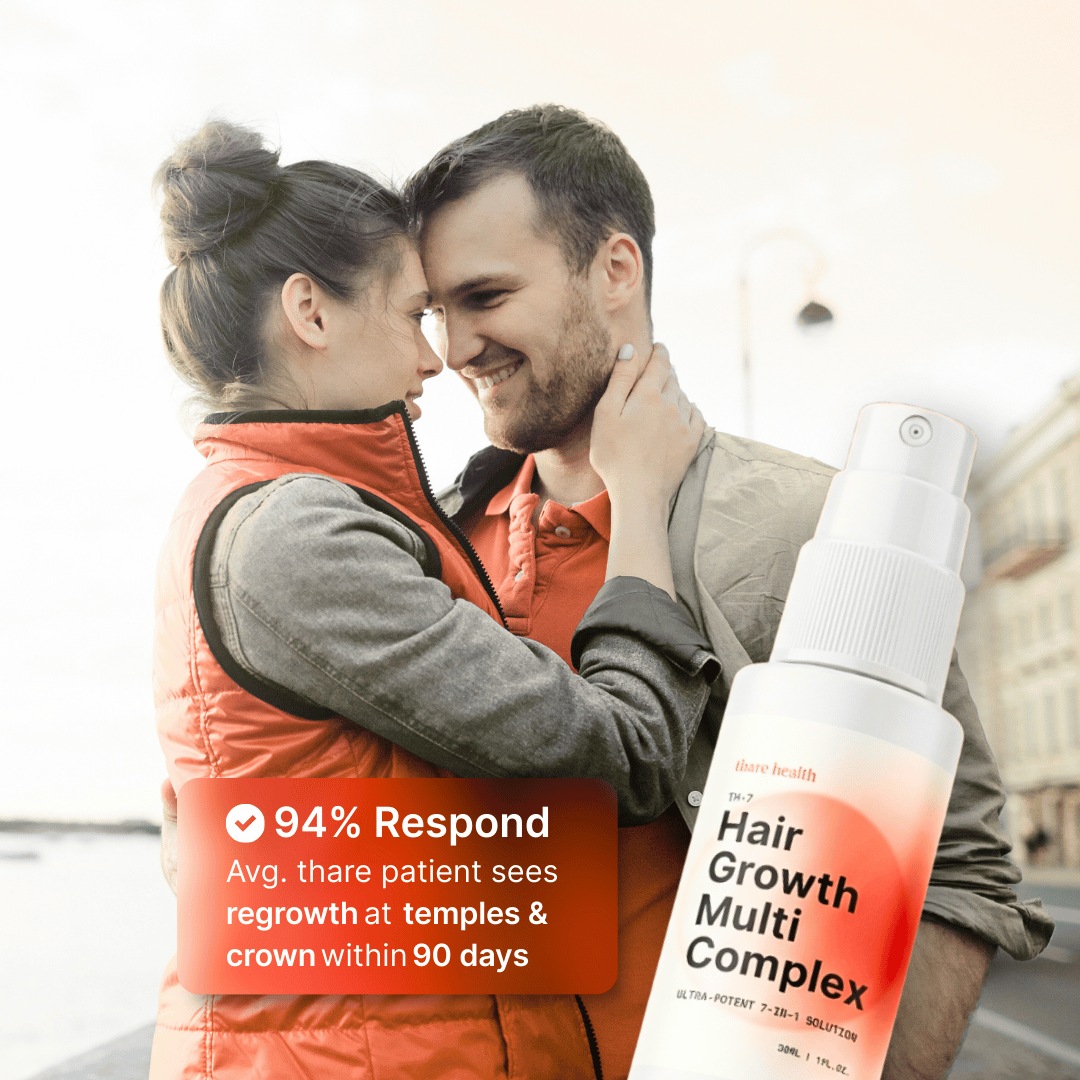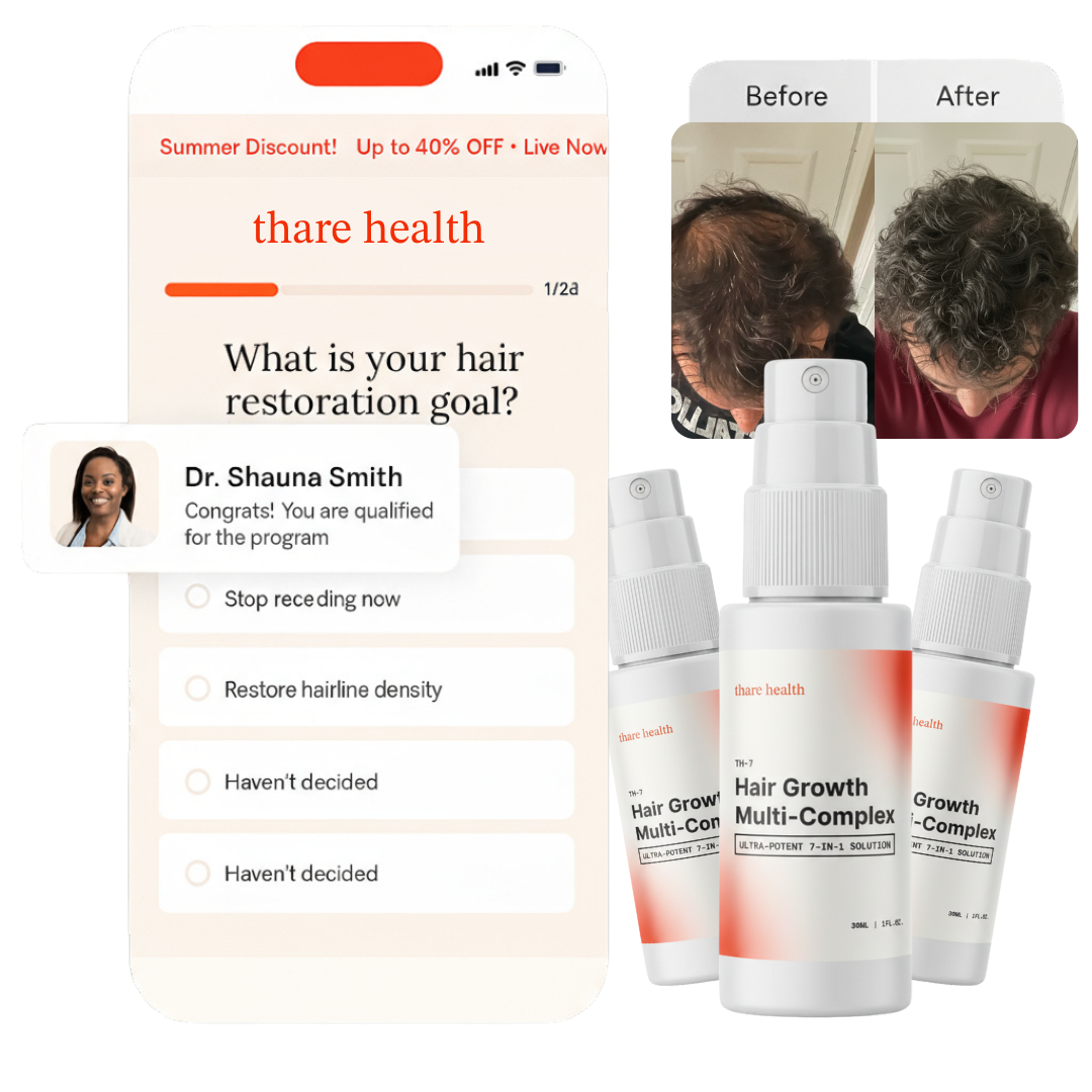 All claims and benefits on this website refer to self-reported data from thare health customers on a treatment plan that includes compounded hair loss medications and consultations with medical professionals. Customers reported their hair loss stage on their initial medical intake questionnaire every 3-4 weeks thereafter. Results from compounded medications found on the thare health platform may vary and be affected by an individual's adherence to the program and their clinician's recommendations. Although compounded hair loss medication is produced in facilities that are highly regulated, the medications are not FDA-approved or evaluated for safety, efficacy, or quality. The decision to use compounded drugs is guided by the licensed provider's medical judgment, which is informed by a telehealth consultation and medical history.
